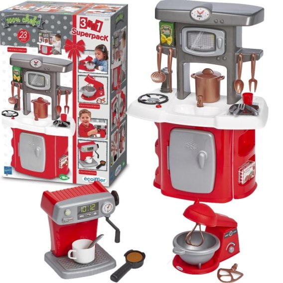 Kuchnia od firmy Ecoiffier wyposażona jest w palnik do gotowania! Ponadto realistyczna stylistyka w tej dziecięcej kuchni do zabawy naśladuje modny wygląd i styl dzisiejszego nowoczesnego wystroju kuchni. Zrób filiżankę ulubionej kawy za pomocą dołączonego ekspresu do kawy. W zestawie jest nawet mikser z misą i dwoma pałeczkami. W kuchni wbudowany mamy lodówkę oraz kuchenkę mikrofalową.