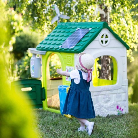 Domek FEBER ECO to domek zabaw, w którym znajdują się wszystkie aktywności potrzebne maluchom do wzbudzenia ciekawości w przyrodzie. Świetne miejsce i świetna nauka dla dzieci! W zestawie 2 kosze do recyklingu (żółty i niebieski), mały ogródek (w doniczkach) i narzędzia. To świetna aktywność na świeżym powietrzu dla dzieci. Można bawić się w sadzenie nasion i obserwowanie wzrostu roślin. Wyposażony jest również w gniazdo i karmnik dla ptaków. A woda deszczowa jest idealna do podlewania roślin lub kwiatów. Wiatrak i imitacja panelu słonecznego dają niesamowite funkcje do nauki o zrównoważonych energiach! Odporne, łatwe w montażu i wyposażone w system Anti UV zapobiegający utracie koloru i zwiększający odporność tworzywa.