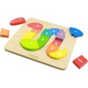 Drewniany wąż to idealny przyjaciel dziecka, które uczy się liczenia. Zwierzak podzielony jest na 11 kolorowych segmentów, które podpisane zostały cyferkami od 0 do 10. Zadaniem dziecka jest ułożenie węża z dostępnych elementów w specjalnym polu na drewnianej planszy. Plansza podpowiada kolejność cyferek, ale dziecko musi wykazać się skupieniem i zapamiętać kolejność liczb.