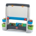 Ogromna dwustronna tablica Step2 zestaw małego artysty to wspaniały pomysł na prezent. Od teraz każdy mały artysta będzie mógł tworzyć własne arcydzieła. Tablica jest dwustronna - z jednej strony to klasyczna tablica kredowa a z drugiej powierzchnia przeznaczona do malowania zmywalnymi flamastrami. Dodatkowo nad tablicą kredową znajdują się dwa klipsy na kartki. Żywe kolory, kształty i tekstury, z jakich wykonano sztalugę, zachęcą maluchy do kreatywnej i twórczej zabawy. Po skończonej zabawie, dzieci mogą przechowywać swoje kredki i flamastry w pojemnikach znajdujących się pod tablicą.