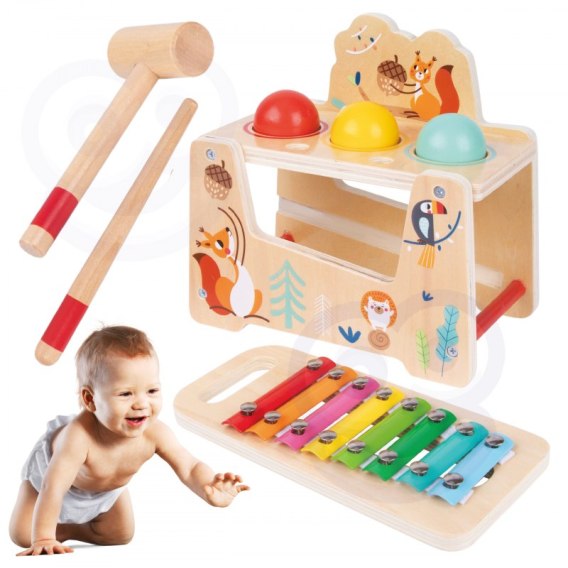 Oto świetny zestaw od uwielbianej przez dzieci firmy Tooky Toy! Ta drewniana zabawka jest inspirowana królestwem zwierząt i przedstawia leśne zwierzęta. Składa się z drewnianej deseczki z trzema otworami. Zadaniem maluszka jest przebicie za pomocą młoteczka różnokolorowych klocków do środka skrzynki. Teraz zacznie się zabawa! Kulki będą uderzać o cymbałki i wydawać radosne dźwięki. Instrument z łatwością można wyjąć i cieszyć się nim jako osobną zabawką. Kuleczki będą wpadały wówczas na powierzchnię, ale zostaną w środku kolorowej skrzynki dzięki czemu nie pogubią się. Zobacz jak to jest być prawdziwym muzykiem!