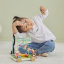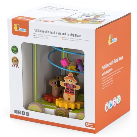 Labirynt Przeplatanka Ciągacz od marki VIGA jest to zabawka o wielu funkcjach wykonana z drewna. Na drewnianej platformie znajdziemy figurkę farmera, krówki oraz pieska. Obok nich znajdziemy pętlę motoryczną z kolorowymi koralikami, słoneczkiem i motylkiem. Dzięki zamocowanym kołom zabawka może pełnić dodatkową funkcję jako ciągacz, a dziecko może zabrać zabawkę ze sobą. Przeplatanka dodatkowo zawiera kolorowe koła zębate, które można obracać. Zwierzątka mogą być zamieniane miejscami.