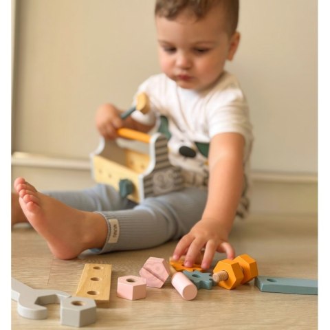 Poznaj zestaw narzędzi dla małych majsterkowiczów od marki Viga z serii Polar Bear, który wprowadza dziecko w świat kreatywnych działań. Dzięki naturalnemu materiałowi i subtelnej kolorystyce pastelowej z szarościami oraz drewnem bukowym, zabawa staje się zarówno przyjemna, jak i estetyczna. W zestawie znajduje się skrzynka oraz narzędzia - wszystko to, by rozwijać manualne zdolności.