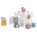 • - zawiera 7 klocków o różnych kształtach - 3 podstawowe kształty geometryczne z różnymi dźwiękami, 3 w kształcie zwierzątek z ich rysunkami oraz jeden z lusterkiem,