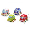 - - 4 miękkie samochodziki: straż pożarna, radiowóz, karetka i taxi.