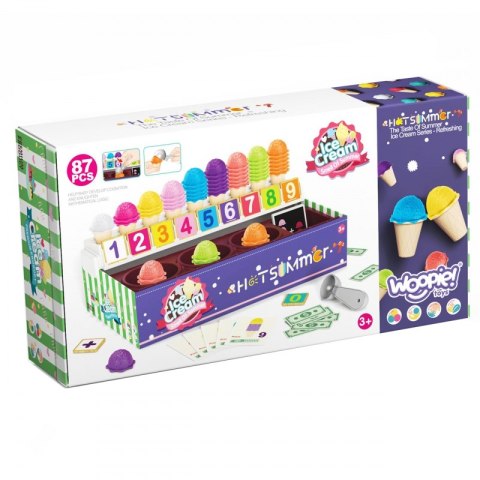 Zestaw Lodziarni  od marki WOOPIE nie tylko pozwoli na zabawę w małego sprzedawcę lodów, ale również pozwoli na naukę liczenia, liczb, kolorów i dodawania. W zestawie znajdziemy 87 elementów, wśród których znajdziemy gałki lodów, wafelki, karty z zamówieniami, pieniądze, żetony z liczbami i łyżkę do lodów. Liczba gałek lodów różni się w zależności od koloru, a na kartach zamówień znajdziemy proste zadania matematyczne. Natomiast poprzez odgrywanie ról dzieci rozwijają swoje zdolności komunikacyjne, pozwolą zmniejszyć stres w codziennych sytuacjach, a także stanowią doskonałą lekcję empatii.