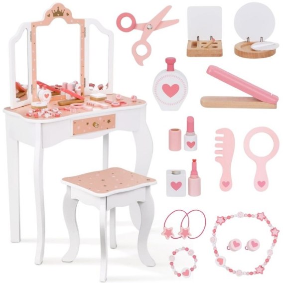 Drewniana toaletka z akcesoriami dla dzieci od Woopie Green to niezwykle urocza i dopracowana w każdym szczególe zabawka, która przenosi dzieci w świat wyobraźni, piękna i kreatywnej zabawy. Zaprojektowana z myślą o najmłodszych miłośniczkach stylu i estetyki, stanowi nie tylko piękny mebel do pokoju, ale również narzędzie wspierające rozwój emocjonalny, społeczny i manualny dziecka. Toaletka zachwyca eleganckim designem inspirowanym klasycznymi meblami dorosłych - ma kształt delikatnego biureczka z potrójnym lustrem, szufladką na drobiazgi i wygodnym stołeczkiem dopasowanym do wzrostu dziecka. Całość wykonana jest z wysokiej jakości drewna,w odcieniach różu, bieli i złota.Trzyczęściowe lustro z ruchomymi skrzydłami umożliwia przeglądanie się z różnych stron, a szeroki blat zapewnia dużo miejsca na wszystkie niezbędne dodatki. W zestawie znajduje się również bogaty komplet akcesoriów, dzięki którym zabawa staje się jeszcze bardziej realistyczna.