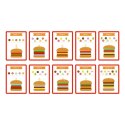 - - zestaw zawiera 15 elementów: 2 bułki, 8 składników burgera, 5 kart z 10 wzorami