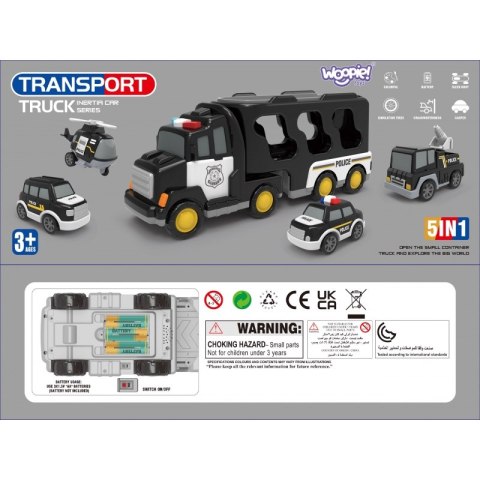 Duży Zestaw Policyjny Ciężarówka + 4 Auta od Marki Woopie Zaprojektowana z myślą o małych pasjonatach Policji, ta zabawka 5 w 1 to idealny zestaw dla każdego małego ratownika! Naciśnij przycisk na górze kabiny ciężarówki, aby zobaczyć jasne migające światła i usłyszeć realistyczne syreny, bardzo atrakcyjne dla dzieci. Zestaw zawiera dużą ciężarówkę transportową oraz cztery pojazdy policji: samochód opancerzony, ciężarówkę z armatką wodną, helikopter, radiowóz. Każdy z pojazdów ma ruchome elementy, które pozwolą Twojemu dziecku poczuć się jak prawdziwy bohater podczas akcji ratunkowych! Zestaw jest świetnym pomysłem na prezent urodzinowy, świąteczny czy na inne okazje.