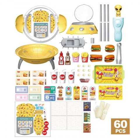 Fast Food UFO od marki WOOPIE to kosmiczny zestaw dla każdego dziecka! Zabawka posiada 3 funkcję. Można włączyć projektor i uczyć się nazw planet. Można użyć go jako stylowy plecak z marsjaninem. Podczas noszenia plecaka głowa marsjanina swobodnie porusza się za szybką statku. Jednak najważniejsza funkcją jest możliwość rozłożenia statku kosmicznego w super restauracje Fast food. Dziecko może wcielić się w sprzedawcę na marsie i bawić się wspólnie z przyjaciółmi. Zestaw zawiera aż 60 el.: wszystkie potrzebne rzeczy, które posiada każdy fast food. Małego kosmitę można złożyć. Funkcja plecaka pozwoli zabrać wszędzie swoją własną przenośną restauracje. Odgrywanie ról i naśladowanie zawodów rozwija świadomość Twojego dziecka oraz pobudza wyobraźnie i kreatywność.