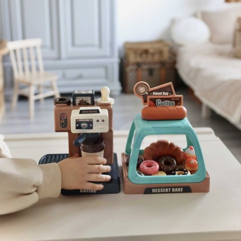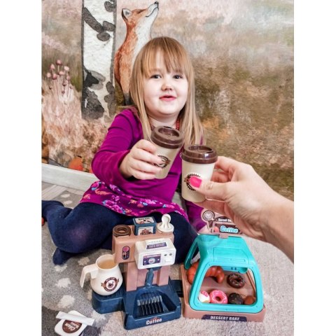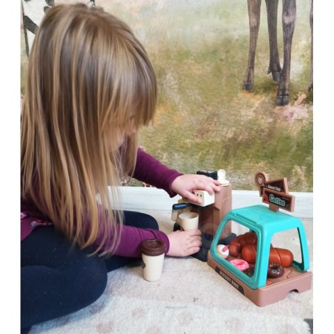 Ekspres do kawy od marki WOOPIE to idealny zestaw dla dzieci, które uwielbia wcielać się w rolę dorosłych. Zestaw oprócz ekspresu i wiaty na ciastka zawiera słodkości takie jak donuty czy babeczki w różnych smakach. Ekspres i witrynę można ze sobą dowolnie łączyć lub używać oddzielnie. Ekspres do kawy ma funkcję przepływu wody, wystarczy nalać od góry wodę do pojemnika, zamontować kolbę ekspresu, podstawić kubeczek i kawa gotowa! Ponadto wydaje dźwięki/odgłosy mielenia i parzenia kawy, świeci się wtedy mrugająca czerwona lampka, a gdy kawa będzie gotowa zaświeci się zielone światło i usłyszymy sygnał zakończenia pracy. Po zamontowaniu portu filtra usłyszymy również odgłos nalewania kawy. Zabawka z pewnością zaciekawi każde dziecko. Zabawa w sklep z przyjaciółmi pomoże rozwinąć świadomość i zdolności społeczne.
