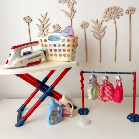 Zestaw do Prasowania od marki WOOPIE dostarczy dziecku mnóstwo zabawy w małą gospodynię domową. W zestawie znajdziemy żelazko, deskę do prasowania, kosz na pranie, stojący wieszak, trzy małe sukienki dla lalek oraz dwa opakowania płynu do prania. Żelazko jest zabawką bezpieczną dla dzieci, ponieważ nie nagrzewa się. Zostało ono wyposażona w wiele funkcji, które urozmaicą zabawę: 1 z przycisków znajdujący się na rączce żelazka który po wciśnięciu i trzymaniu odwzorowuje prawdziwe dźwięki prasowania, świecącą lampkę LED oraz efekty dźwiękowe w postaci piosenek. Jest to doskonały zestaw dla dzieci, które uwielbiają naśladować rodziców podczas codziennych czynności.