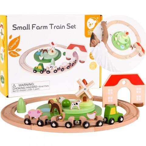 CLASSIC WORLD Drewniana Kolejka Farma to piękny zestaw wykonany z najwyżej jakości drewna. Świetna alternatywa dla plastikowych zestawów. Pomalowana nietoksycznymi i bezpiecznymi farbami dla dzieci. Dzięki kolejce dziecko może z nami poznawać świat, zwierzątka oraz otaczające miejsca. Wspaniały pomysł na wspólne spędzanie czasu z pociechą lub do zabawy z koleżankami i kolegami dla Naszego Dziecka. Zestaw składa się z drewnianego toru, pociągu z wagonami, zwierzątek, stacji kolejowej, wiatraka, pasma zieleni, na którym mogą być również zwierzęta. Przeznaczony dla dzieci powyżej 3 roku życia.