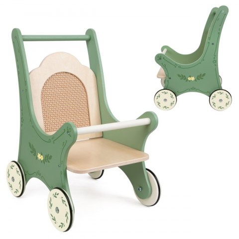 Ten uroczy wózek dla lalek marki Classic World to idealne połączenie tradycji i nowoczesnego wykonania. Zabawka o klasycznym, retro stylu jest w przeważającej części w kolorze zielonym z uroczymi, kwiecistymi wzorami i rattanowym, plecionym oparciem. Stabilna i solidna konstrukcja zachęca dzieci do zabawy w odgrywanie ról i spacery z ulubionymi lalkami i pluszakami. Ten uroczy wózek to must-have dla każdej małej miłośniczki zabawy w dom.