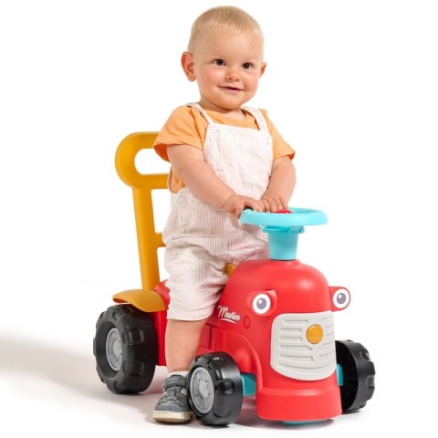Maurice to uroczy traktorek francuskiej marki Falk, który będzie towarzyszem pierwszych kroków Twojego dziecka. Jasne kolory i zaokrąglone kształty zachwycą każdego malucha. Uruchamianie traktora za pomocą małego pokrętła dźwiękowego oraz dźwięk z klaksonu umieszczonego na kierownicy to wspaniała pierwsza nauka, która pobudzi umiejętności motoryczne i słuch Twojego dziecka. Jeżdżąc na jeździku, bawiąc się kierownicą z klaksonem i skrętnymi kołami dziecko będzie ćwiczyło koordynację i równowagę. Stojąc z tyłu, może korzystać z ergonomicznego oparcia, aby uczyć się chodzić przez zabawę, bez strachu i całkowicie bezpiecznie. Pod siedzeniem znajduje się niewielki schowek do przechowywania skarbów.