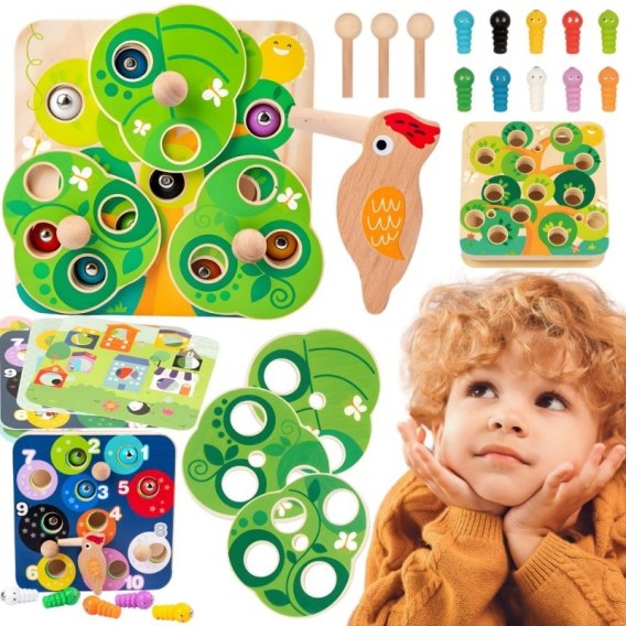Kolorowa, drewniana gra magnetyczna marki TOOKY TOY z uroczym dzięciołem do łowienia gąsienic łączy zabawę zręcznościową z edukacją. Dołączone drewniane plansze pozwalają na naukę kolorów, liczb kształtów oraz zwierzątek. Obrotowe liście zasłaniają gąsienice dodając wyzwanie do zabawy. Solidna, gładko wykończona konstrukcja i magnesy sprawiają, że każde wyciągnięcie gąsienicy daje satysfakcję i zachęca do dalszej, zabawy.