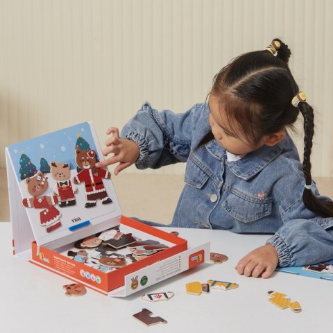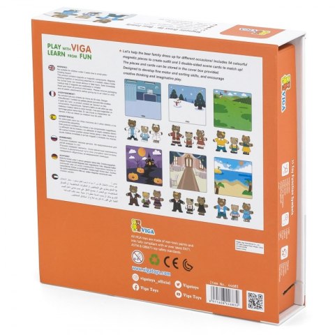 Magnetyczna układanka marki VIGA to zabawka, która pozwala dzieciom na ubieranie i zmienianie strojów u uroczych niedźwiadków. Zestaw zawiera 54 magnetyczne elementy w różnych kolorach, które można łączyć w różne kombinacje, aby stworzyć ciekawe stroje dla niedźwiadków.
