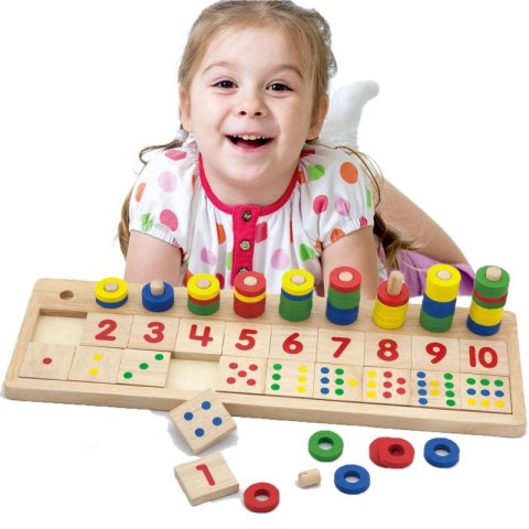 - - zestaw składa się z podstawki z 10 kołeczkami, na której umieszcza się krążki, klocki z numerami i kropkami,