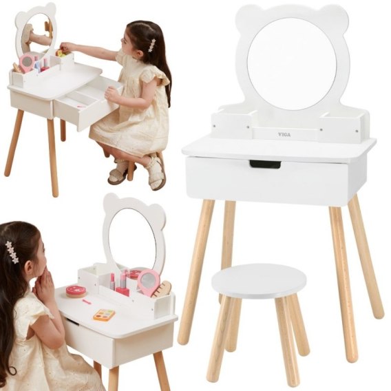 Duża, wolnostojąca biała toaletka od Viga to wymarzony mebel w pokoju każdej dziewczynki. Toaletka posiada wysuwaną szufladę, w której mała księżniczka może schować swoje skarby. Pod samym lustrem znajdują się przegródki na poręczne akcesoria. W zestawie znajdziemy również krzesełko do toaletki. Całość wykonana z drewna i pomalowana nietoksycznymi farbami bezpiecznymi dla dzieci i środowiska.