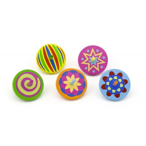 Kolorowe drewniane bączki zachwycą dziecko podczas zabawy. Podczas kręcenia się bączki tworzą ciekawe wzory, które spodobają się dzieciom.
