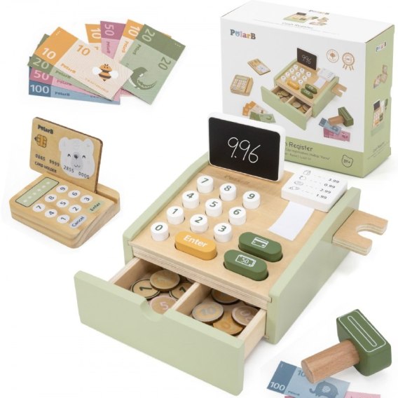Kasa sklepowa to świetna drewniana zabawka, która pozwoli na odegranie wielu scenek, jakie mogą mieć miejsce w sklepie. Dzieci mogą wcielić się w role kasjera, lub klienta, oraz wspólnie ćwiczyć interakcje społeczne, oraz swoje zdolności komunikacyjne. Gotówka, czy karta? Policz sumę należności, przyjmij pieniądze i wydaj poprawnie resztę. Kasa zawiera banknoty, monety, oraz kartę płatniczą. Dziecko może uczyć się bawiąc! Królowa Nauk - matematyka nie będzie już straszna.