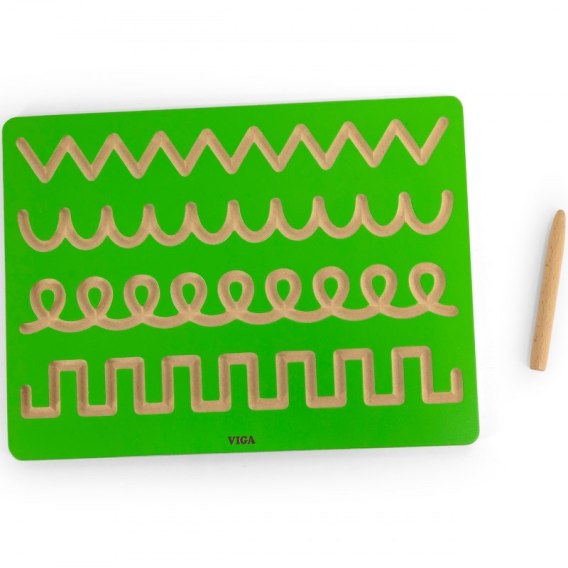 Tablica kreślarska od marki VIGA to idealna propozycja dla dzieci do trenowania rączki przed nauką pisania. Delikatnie wygrawerowane  i zakrzywione rowki sprawiają, że idealnie nadaje się dla dzieci do kontrolowania ruchu dłoni i kształtowania pamięci mięśniowej poprzez wielokrotne śledzenie. Tablica jest dostępna w kompaktowych rozmiarach, dzięki czemu dzieci mogą ją trzymać i używać na stole lub biurku.Dziecko poprzez zabawę uczy się ruchów odpowiedzialnych w przyszłości za rysowanie i pisanie, kształci płynność ruchów oraz ćwiczy koordynację wzrokowo - ruchową.