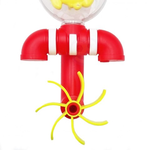 • - podczas wlewania wody różne elementy obracają się i wylatują z kraników oraz kręcącego się kołowrotka wprost do wody,