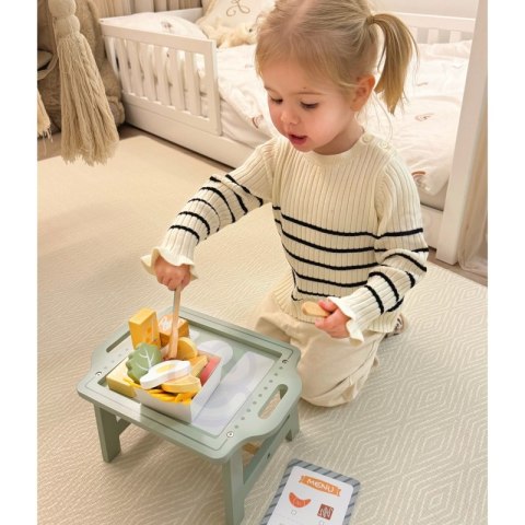 Urocza pastelowa taca i realistycznie wykonane drewniane elementy sprawiają, że zabawa staje się wyjątkowo angażująca i inspirująca