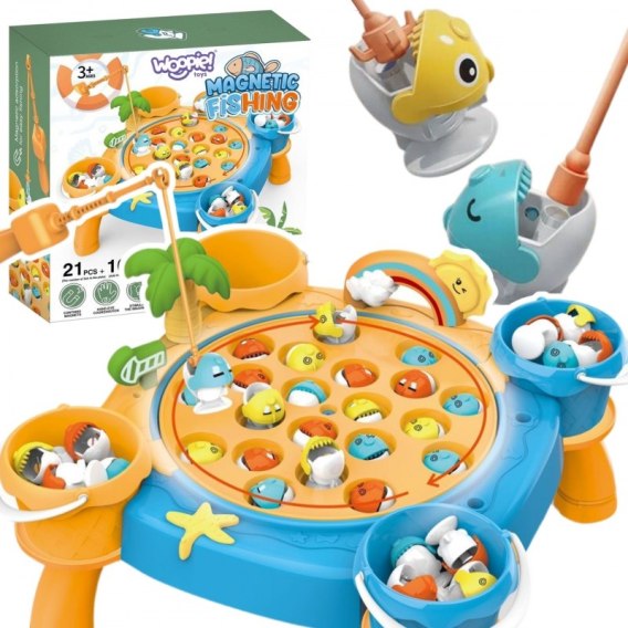 Łowienie rybek na magnes od marki WOOPIE  to zabawka, która naśladuje wędkowanie, ale z wykorzystaniem magnesów. Składa się m.in z wędki z magnesem którą można łowić rybki z metalowymi elementami, a później złowione zdobycze umieszczamy do przymocowanych wiaderek na planszy. Gra ta ma na celu rozwijanie zręczności manualnej, koordynacji ręka-oko oraz precyzji. Jest to także zabawa, która może być wykorzystana do nauki kolorów, kształtów oraz liczenia, gdyż rybki różnią się kolorem i kształtem. Łowienie rybek jest popularną zabawką dla dzieci w wieku przedszkolnym i wczesnoszkolnym, zapewniającą zarówno rozrywkę, jak i rozwijanie umiejętności poznawczych i motorycznych. Dodatkowo, jest bezpieczną alternatywą dla tradycyjnego wędkowania, szczególnie dla dzieci, które nie są jeszcze gotowe na prawdziwe rybołówstwo.