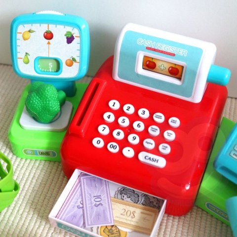 Kasa Sklepowa z Waga i Koszykiem od marki WOOPIE to świetny wybór dla dzieci od 3 roku życia. Zabawka rozwija wyobraźnię dzieci i zachęca je do kreatywnego myślenia. Mogą ważyć owoce i warzywa, a następnie wbijać je na kasę. Będą mogły zapłacić na dwa sposoby: tradycyjnie za pomocą pieniążków, karty płatniczej. Wszystko to jest dołączone do zestawu i zapewni dziecku długie godziny fajnej zabawy.