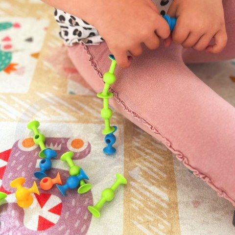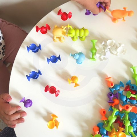 Zestaw klocków konstrukcyjnych od marki WOOPIE to świetny prezent dla twojego malucha! Klocki wykonane zostały z silikonu, są mięciutkie i bezpieczne podczas zabawy. Klocki są edukacyjną zabawką. Pomagają w poznawaniu nowych kształtów, kolorów oraz rozwijają zdolności manualne. Klocki zaprojektowane są tak, aby pobudzić rozwijające się zmysły dziecka: wzrok poprzez wyraziste kolory oraz dotyk poprzez oryginalny kształt i sposób łączenia. Wszystkie elementy również dodawane w zestawie figurki stworki są łączenie na mocne przyssawki. Przyssawki przyklejają się do siebie i do każdej gładkiej powierzchni. To nowy gatunek klocków. Wyginają się, przyklejają się, dyndają, wsysają w inny wymiar kreatywności. To elastyczni pracownicy zawsze gotowi do zabawy i eksperymentowania, przyklejania do wanny, okna a może ściany, komputera, a może.. telefonu... i jak grzeczni goście nie pozostawiają śladów swojej obecności.