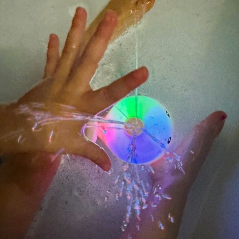 - - Wielorybek bez podstawki, po umieszczeniu w wodzie zaczyna się świecić na różne kolory, tworząc przy tym fontannę z wody