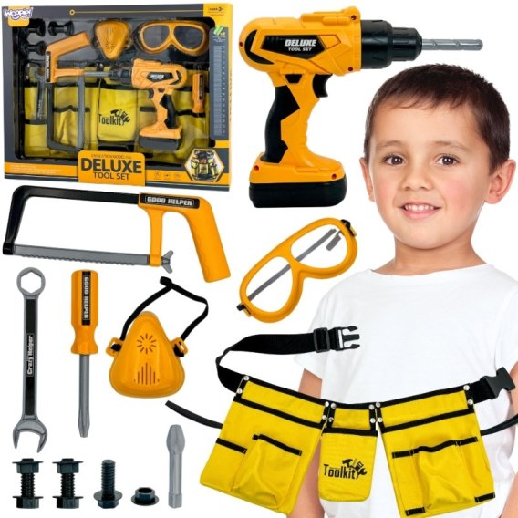 • WOOPIE Zestaw Narzędzi Małego Majsterkowicza Gogle Wkrętarka Pas Na Narzędzia 16el.